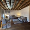 Caratterizzato da un ampio e moderno soggiorno con travi decorate, offre un comodo divano da cui godere della TV, un tavolo da pranzo in vetro, una camera matrimoniale con armadio e poltrona, una cucina completamente attrezzata e un elegante bagno in marmo completo di doccia e piccolo spazio esterno.