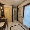 Featuring a spacious and modern living room with decorated beams, it offers a comfortable sofa for watching TV, a glass dining table, a double bedroom with a wardrobe and armchair, a fully equipped kitchen, and an elegant marble bathroom with a shower and a small outdoor space.